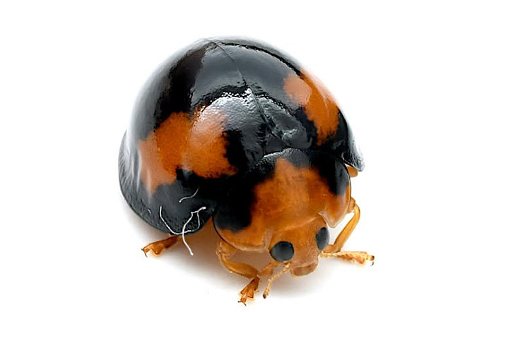 ↑紅紋瓢蟲 ,翅鞘黑色,基部左右有2枚橙紅色斜向的斑紋。