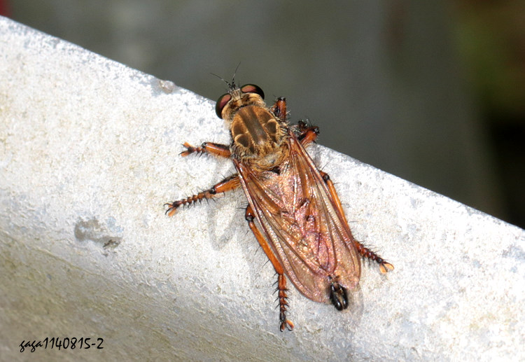 (食蟲虻科 / 食蟲虻亞科 /亞士食蟲虻屬 ) 中大型,頭部寬大於胸部,胸背板褐色,背上具縱紋和橫斑,翅膀淡褐色透明,腹部末節黑色,各腳褐色。
