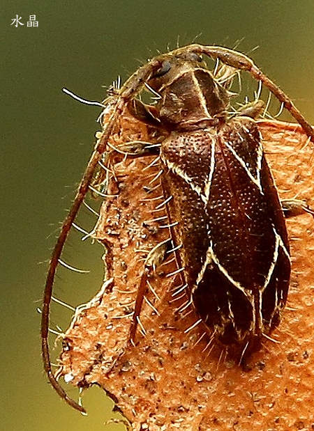 ↑梅峰瑣天牛 攝影:水晶 (天牛科 / 粗天牛亞科) 體長約8mm,觸角常超過翅端,體色黑褐色具不明顯的紫色光澤,前胸背板中央有一條白色縱線,兩邊各有1枚ㄑ字紋短斑,翅鞘具刻點,上下各有一個白色的V型線紋,端部下方為倒V字紋,斑紋達翅端,觸角及翅緣密生刺毛。本種又稱《蜘蛛網紋微小天牛》,分類於粗天牛亞科/瑣天牛屬,體型很小,為台灣特有種,稀少。