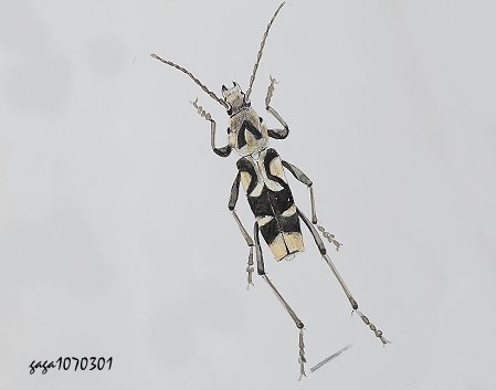 (天牛科 / 虎天牛族)本屬20種,本種體色灰黑色,前胸背板中央有1枚黑色倒V字斑紋,左右側緣各有1個小斑點,合翅時翅鞘有3列斑,第1斑呈C字紋,左右不相連,第2-3斑為寬大的黑色橫帶,左右相連,與近似種相較,本種2-3列黑色寬型橫帶上下間距很小。