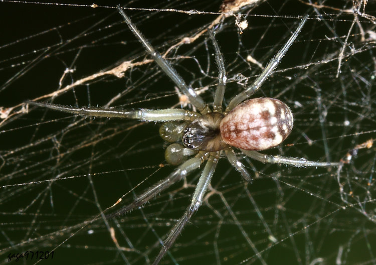 ↑蓋皿蛛屬 Neriene sp ,腹背灰白色,中央有一條褐色的縱紋,左右分叉,近後方有2枚褐色大斑,腹端黑色具白色細斑點排列橫向。