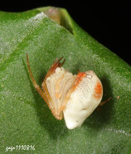 ↑鬼蛛屬 (大溪) (金蛛科 / 鬼蛛屬) 體長3.7mm,體色白色,腹部長橢圓形,背部拱起具2列不明顯的黑斑,上列2枚˙下列3枚,近腹端有粉紅色分布。 本種紀錄於低海拔山區,棲息低矮的葉背,被騷擾時各足縮在頭胸部兩側,形態十分特別。
