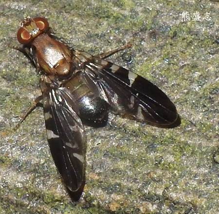 ↑ 線黑翅實蠅 (花蓮 / 白雲步道) (果實蠅科) 中大型,腹眼紅褐色,胸背板褐色,側緣密生長鬃毛,腹部褐色,近末端黑色,翅膀黑色,近前緣前半有3-4枚白斑排列,近後緣有3枚白斑。 本屬2種,本種普遍分布於低海拔山區,已知幼蟲取食竹筍,成蟲常出現在竹林裡,為竹產業的害蟲之一。