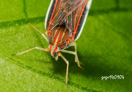 ↑新斑袖飛蝨,前胸背板有3條白色縱紋。