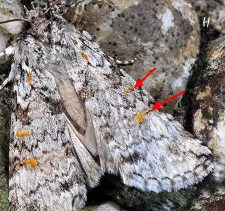 ↑詹氏平波紋蛾,前翅中室上下各有一枚黑色的橫斑,有些個體鑲黃色邊紋,翅端有一條黑色線紋二分頂角。 / 攝影: H
