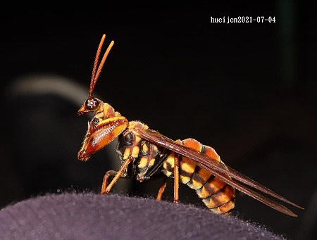 ↑梯螳蛉屬 Euclimacia sp.,胸背板黑色的個體,腹部橙紅色。