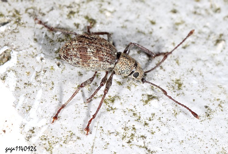 ↑粗喙象亞科 Entiminae (象鼻蟲科 / 粗喙象亞科 Entiminae ) 型態描述:體長5.6mm,體色淡褐色,體表密生刻點,觸角很長,腹部長橢圓型,翅鞘具不明顯的寬型橫帶。外觀近似Sciopithes obscurus,該屬主要分布於北美洲。 另一個 Myllocerus屬,印度及中南半島多個國家紀錄。 本種紀錄於海拔1800-2200公尺山區,稀少。