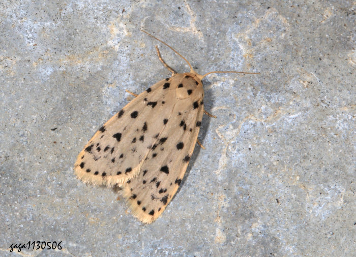 ↑弱干苔蛾 Siccia sordida (裳蛾科 / 苔蛾族 ) 型態描述:小型,體色淡黃色或白色,前翅密生黑色斑點,其中中室附近的2枚斑點最大,上下排列,亞外緣線為模糊狀的波狀橫帶,端線具黑色斑點,整體翅面的斑點大小具個體差異。 本屬1種,為 暗小苔蛾 Siccia fumeola Hampson, 1914 但暗小苔蛾查不到相關的資料,本種可能是台灣名錄弱干苔蛾 Aemene sordida的同種異名,國外網站顯示 Aemene sordida是Siccia sordida這一種,主要分布於南非、印度、泰國,台灣則很少見到這一種的相關照片。 維基百科翻譯為乾苔蛾屬,本種紀錄於1000公尺左右山區,稀少。 其他:1140621、