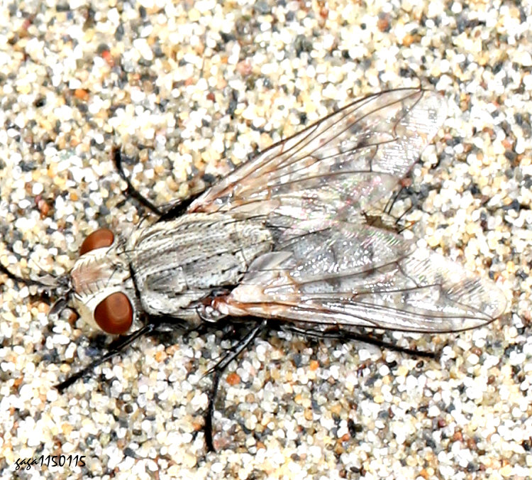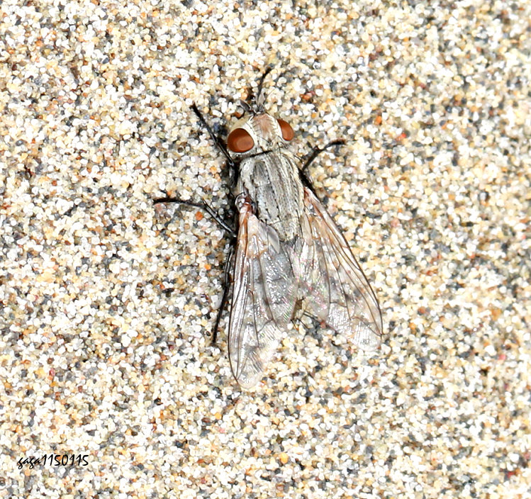 ↑污蠅屬 Wohlfahrtia sp. (肉蠅科 ) 物種描述: 體長約 8 - 10 mm,頭部白色,複眼為鮮豔的褐色,體背灰色,胸背板有3條灰黑色縱帶,腹部有4條黑色橫帶。 本屬目前台灣名錄沒有,本種紀錄於海邊沙地,體色與沙灘融為一體,具良好的保護色,稀少。 國外有多種紀錄,一般棲息沙地,俗稱沙地上的蒼蠅,如 Wohlfahrtia nuba,該屬有些腹部具斑點,有些具黑色的橫帶。 (附記)