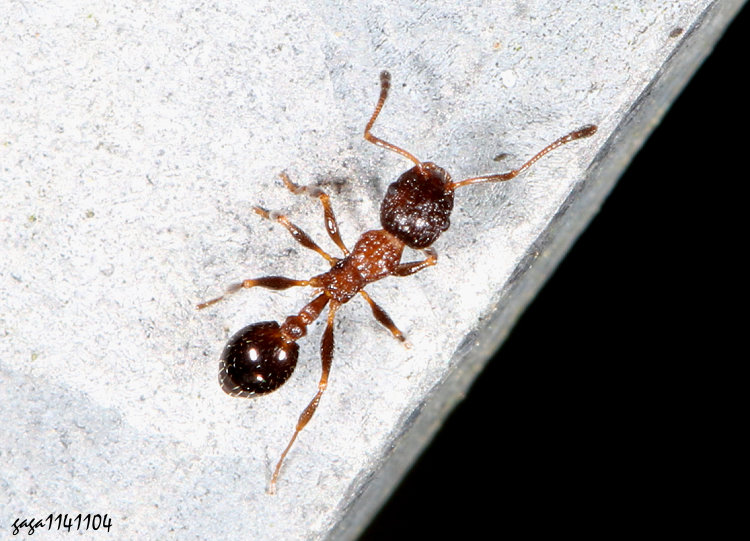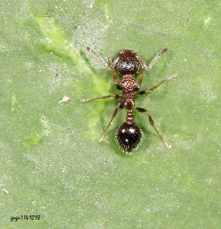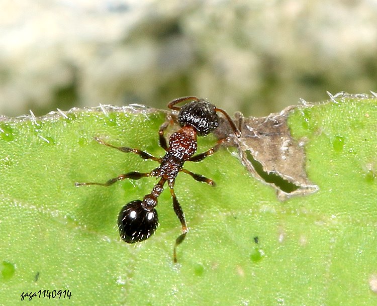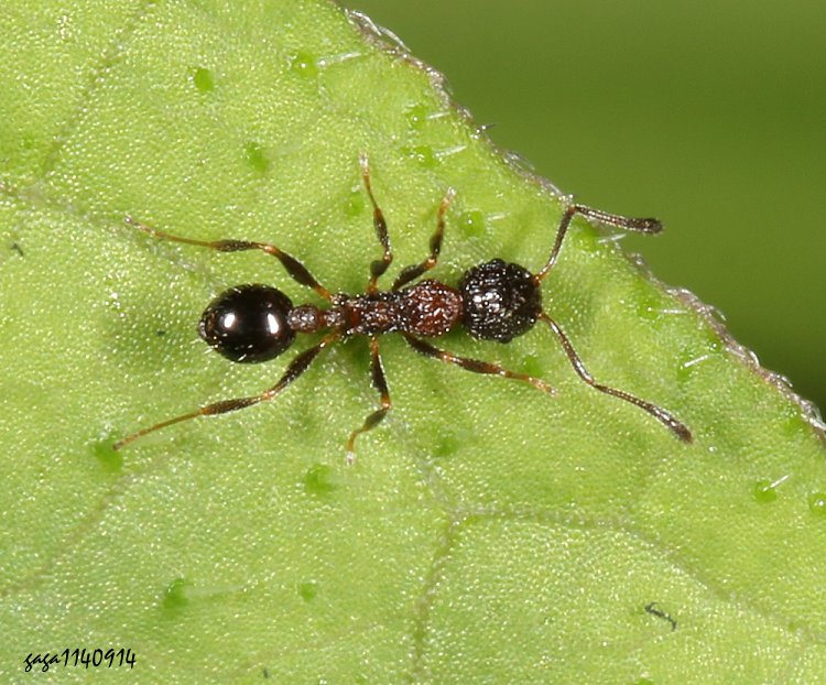 ↑天蓬痕胸家蟻 Temnothorax tianpeng (蟻科 / 家蟻亞科 / 切胸蟻屬 ) 物種描述:體長2.8-3.2mm,頭部及腹部黑色,其餘褐色,胸背板密生瘤突。 本屬9種,本種紀錄於海拔800-1000公尺山區,普遍。 其他:1141018、 本屬9種,為