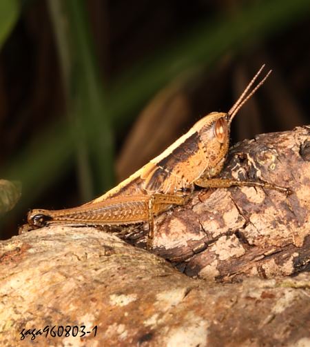 (蝗科) 若蟲,中型,身體狹長,淡褐色,胸背板側緣具一條寬型的黑色縱帶,下不平整。