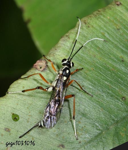 ↑花胸姬蜂 ,觸角後半白色,端部黑色,胸背板側緣白色,中央有一枚白斑,中胸楯板白色,各腳細長,褐色,跗節白色。 (石獅山)