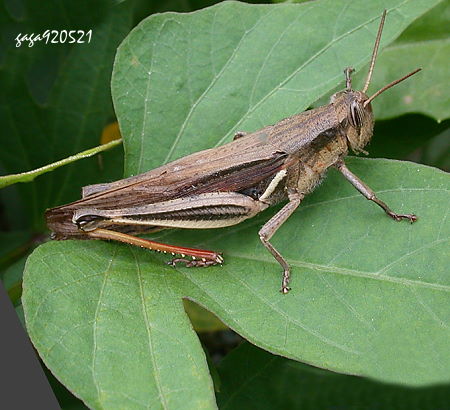 (蝗科 / 直斑腿蝗屬 ) 中大型,外觀近似白條細蝗,但本種胸背板較寬而扁,複眼後方具明顯的黑色縱紋,體色較暗。