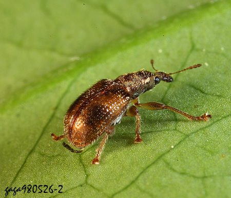(象鼻蟲科 / Entiminae亞科) 中小型,觸角長而直,體色褐色,前胸背板略呈長筒狀,頭突粗短,觸角長在端部兩側,翅鞘密生細毛,具刻點呈縱向條紋,近中央左右具不明顯的黃褐色斜紋˙左右相連。