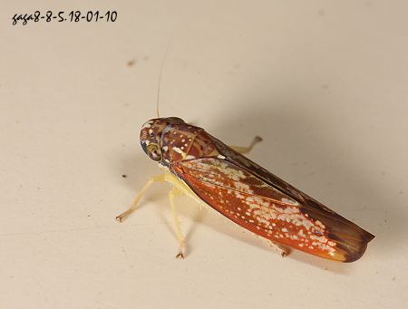↑縱帶斑大葉蟬 (福山) (葉蟬 / 大葉蟬亞科)小型,體背黃褐色志宏褐色,前胸背板布滿白色圓斑點,中央及兩邊具白色縱斑,中央的斑是帶狀,小盾片內有5條白色縱斑,兩側斜向,翅面也密布白斑,翅縫上有一個近長方形的褐色塊狀斑,各腳白色。 本屬3種,本種分布於低海拔山區,曾見在蕨類植物的葉上棲息。(學名提供:林佑昇)