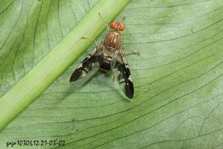 (果實蠅科) 小型,頭寬約等於胸寬,複眼橙紅色,胸背板有5條褐色的縱紋,中間的3條端部相連並擴大,腹背具黑色的環紋,翅膀前緣近基部有一條白色的長斑,近後緣透空的區域較多。