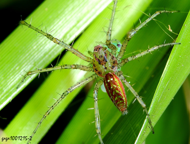 ↑綠貓蛛屬 / 550-650公尺 (貓蛛科) 體長7.8mm, 外觀近似台灣綠貓蛛但本種腹背中央有黃色的八字紋排列,腹部紅褐色。 本屬1種,本種紀錄於低海拔550-650公尺山區,棲息禾本科上,若蛛腹背也有近似八字型的斑紋,體綠色,稀少。 (附記) 型態近似Peucetia flava,該種主要分布於南美洲,範圍從委內瑞拉延伸至阿根廷。 Peucetia viridans,美國南部、墨西哥、中美洲以及西印度群島的許多島嶼。(以上引用網路資料)