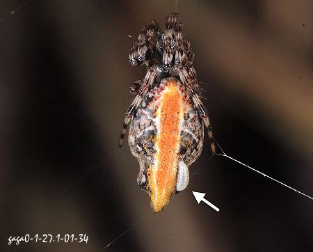 ↑嗜蛛姬蜂屬群,幼蟲(箭頭指處)白色,蛆型,附著於蜘蛛的體表,圖中被姬蜂寄生的為熱帶塵蛛。