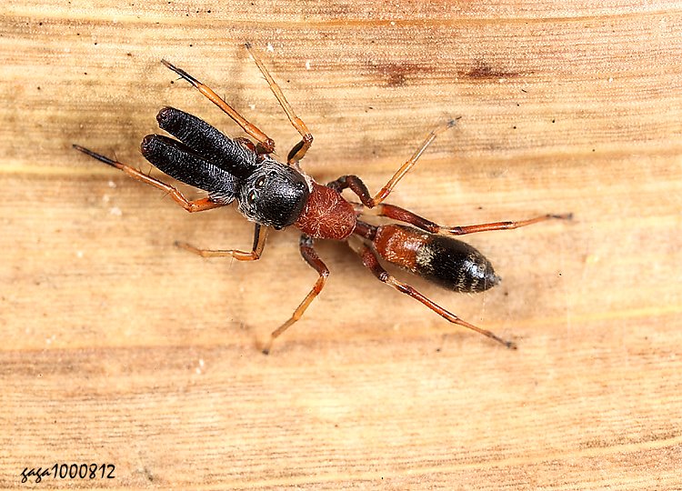 ↑美麗蟻蛛 Myrmarachne formicaria (雌) , 紀錄於海拔1000-1100公尺山區。 (蟻蛛科) 體長約 5-7mm,體色黑褐色,眼域區邊緣黑色,腹部長卵型,中間上方左右各有一枚白斑,腹部間具縮隘的柄。雄蛛觸肢發達,頭部黑色,胸部褐色,腹端黑色。 本屬9種,本種紀錄於中海拔800-1800公尺山區,稀少。 本種目前台灣名錄沒有這個學名。 美麗蟻蛛 Myrmarachne formicaria,廣泛分布於歐洲、北美洲、中國、南韓、日本和台灣。