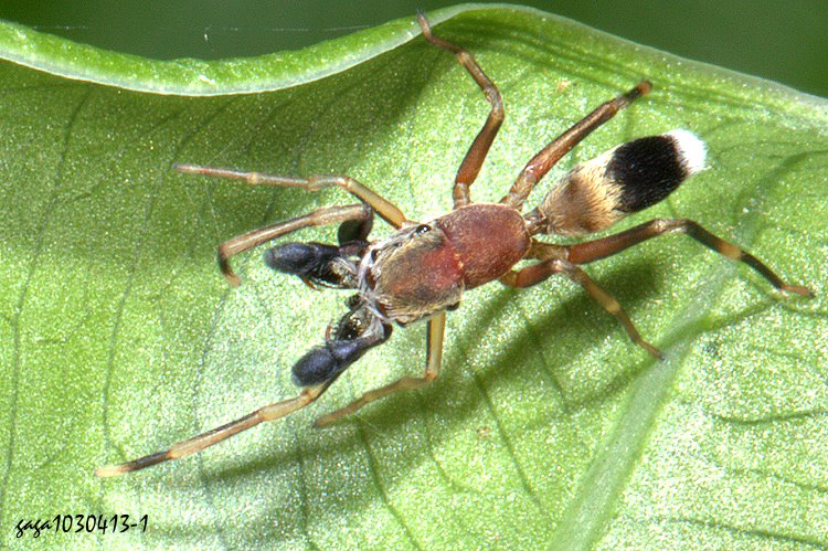 ↑寬胸蟻蛛 (雌) (蟻蛛科/托歇蛛屬 ) 體長4-5.5mm,雌,體色一般黑色,眼域區內密生短毛,頭胸部寬長,腹部長卵型,腹部間具縮隘,腹端窄,各腳紅褐色至黑色。雄蛛一般紅褐色,觸肢細長,端部膨大,腹部具黑色大斑。 本屬2種,本種又稱寬胸托歇蛛,紀錄於低海拔山區,少見。 其他:1140624-1、
