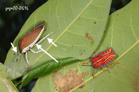 ↑荔枝椿象,2015年發現在北部數量很多,寄主也從龍眼樹、荔枝,轉棲台灣欒樹,成蟲、若蟲群聚於嫩葉處。 其他:帶著60mm上山拍照