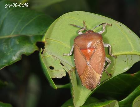 ↑荔枝椿象 (荔椿科)體長24mm,觸角4節,黑褐色,體背黃褐色至灰褐色,前胸背板向後延伸覆蓋住小盾片基部,背方隆突具不明顯的橫向褶紋或刻點,側緣弧型,下緣截平,小盾板橙紅色,前翅革質翅大於膜質翅,膜質翅透明,腹背板外露,各腳黃褐色或密布白色蠟粉。本屬一種,又稱荔枝椿象,多數出現於無患子科的龍眼樹、荔枝、台灣欒樹等多種植物寄主,若蟲五齡,體色鮮艷具白色條紋,外觀呈矩型,體扁,成蟲體型如盾,碩大,若蟲與成蟲群聚,植食性,3-5月出現,2015年在北部平地至山區大量出現。