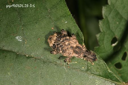 (象鼻蟲科)本種體長13mm,體型碩大,前胸背板具圓形凹陷的刻點,兩側有淡黃褐色的縱帶,翅鞘黑色密布淡黃褐色的分布,有不明顯的縱向條紋及白色細緻的刻點,翅端淡黃褐色,各腳黑色,腿節具不明顯的白色短毛。
