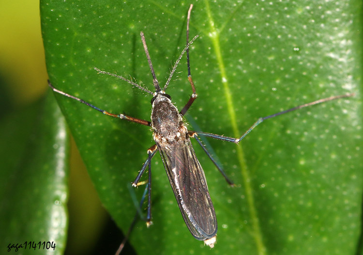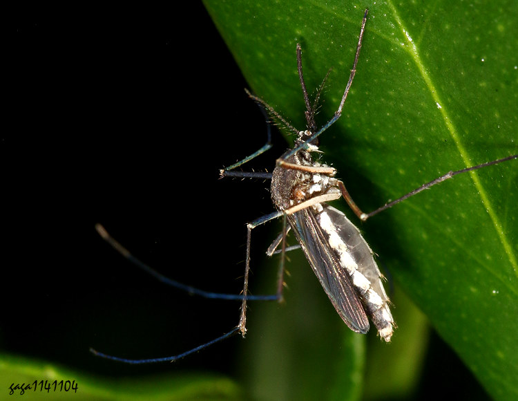 ↑白腹叢蚊(雄) (蚊科) 體長4-7.5mm,頭部白色,頭背具褐色的斑紋,胸背板褐色,側緣具白色的斑紋,一般白色三角型,翅膀具藍色的色澤,各腳褐色,脛節或跗節藍色具光澤,但個體差異很大。 本屬7種,本種普遍紀錄於平地至低海拔1000公尺山區 ,喜歡陰暗潮濕的樹林或草叢,通常於戶外,雌蚊會叮人,雄蚊觸角羽狀,不會吸血。 (附記) 叢蚊屬台灣已知7種,目前網路都將近似種都歸到白腹叢蚊Armigeres subalbatus,個人紀錄到許多照片胸背板及腹部斑紋特徵並不完全一致,有些個體脚的顏色變異很大。本欄站片暫置於同一種,未來應該會有更精確的分類報告出來。 本屬7種,為 Armigeres subalbatus 白腹叢蚊 其他:1141103、