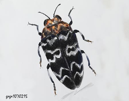 ↑桑德氏矮吉丁蟲 ,中央的2列白色斑紋於內側端上下相連。