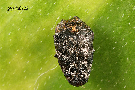↑桑德氏矮吉丁蟲 (吉丁蟲科) 體長3.5-4mm,頭部及前胸背板黑色具金色的絨毛,前胸背板下緣呈波浪狀,中間的凹凸弧度較大,翅鞘黑色具銀白色的絨毛所形成的斑紋,中央的2列白色斑紋於內側端上下相連,近翅端部的2列波浪狀斑紋上下不相連。 本屬體色黑色或黑褐色,具灰白或金黃色短毛,橢圓形,常出現在寄主植物葉面,乍看像一粒蟲糞,除了覓食外一般都以這種姿勢棲息,遇到危急會以彈跳的方式逃離。本種主要分布於低海拔山區,寄主植物不詳。