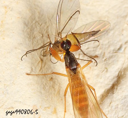↑螳舞虻 Hemerodromia sp. (北橫) (舞虻科 / 螳舞虻亞科 /螳舞虻屬 ) 體長4.2mm,頭部圓型,頭寬大於或等於胸寬,觸角短,第一節膨大,其餘線狀,前胸背黑色狹長,背方微隆突,翅膀透明,腹背淡黃褐色具褐色環紋,各腳淡黃褐色無斑,前腳基節特長,腿節粗壯酷似螳螂的捕捉足。 本種紀錄於中海拔山區,棲息水邊環境,夜晚會趨光,以捕捉足獵食到一隻蕈蚋。