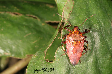 ↑厲椿象,褐色個體,小楯板左右各有一枚黃白色縱斑但前胸背板不具金綠色縱紋。