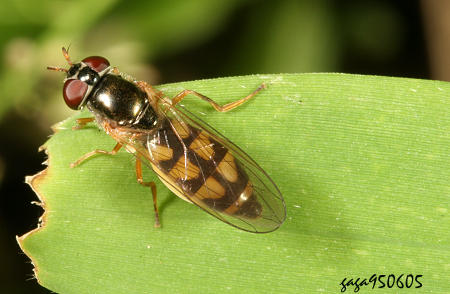 ↑階梯蚜蠅 Melanostoma scalare ,腹部黑褐色,各節背面具黃色的大斑,形成6個分離的黃斑。 (溪頭)
