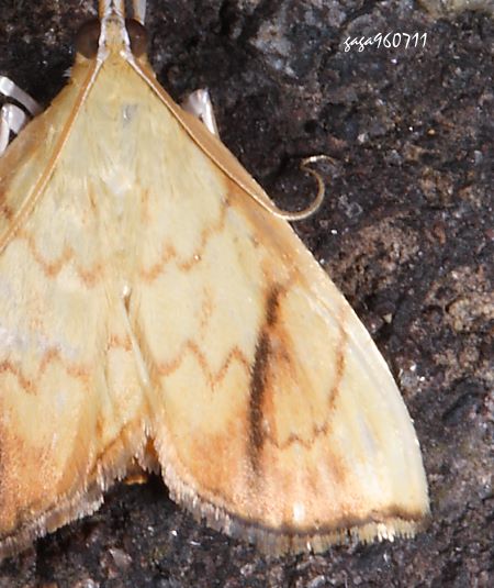(草螟蛾科 / 野螟蛾亞科) 小型,外觀近似野螟蛾 Hyalobathra illectalis ,但本種第2-3列中央有一條黑褐色影狀縱斑與中室上下橫脈相連。