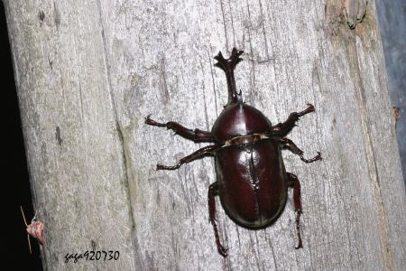 ↑獨角仙 (雄) (金龜子科) 體長35-55mm(不含犄角),外觀近似鍬形蟲但卻屬於金龜子科,體色紅褐色具微弱的光澤,雄蟲頭部前方有一個鹿角狀的犄角,末端開叉,前胸背板也有一枚小犄角,末端開叉。 雌蟲無犄角,黑褐色,不具光澤, 前腳脛節端部外側有2枚棘刺,部分雄蟲小型個體頭部前方無犄角但前胸背板仍有一枚小犄角,樣子很像雌蟲容易看錯。 本屬1種,本種又稱雙叉犀金龜,普遍分布於低、中海拔山區,成蟲5 - 7月出現,常見成群的雄蟲聚集於木犀科的光蠟樹吸食樹液,有時出現上百隻,把樹幹啃得滿目瘡痍,8月以後就比較不容易看到牠們了。
