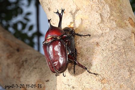 ↑獨角仙,雄,正在刮取光蠟樹皮,吸食樹液。