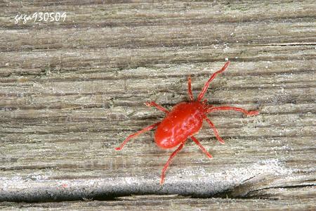 ↑絨蟎,種別同上,體背紅色,體型橢圓形肥胖,各足細長,末端有白色的墊片,在野外常見於植物葉面棲息,是一種寄生於昆蟲體表的小動物。(體長 2.5-3.6 mm)