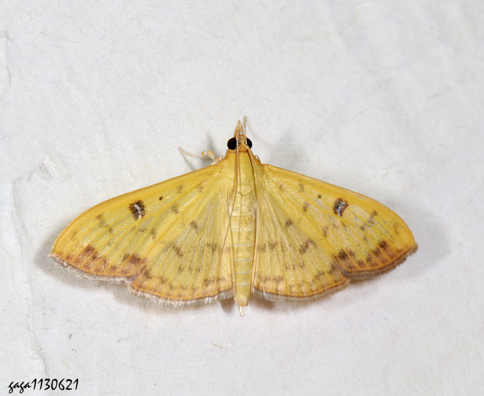 ↑黃翅綴葉野螟蛾 (草螟蛾科 / 斑野螟蛾亞科) 展翅18-19mm,翅面黃色,中外線及亞線為黑褐色波狀紋,中室內有1枚橢圓型黑褐色大斑,內鑲一枚白色線紋,前翅外緣具褐色寬型分布。 本屬3種,本種紀錄於低海拔山區,幼蟲寄主水柳,數量較同屬另2種稀少。