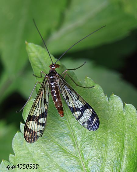 ↑新蠍蛉屬 Neopanorpa sp. (雄) (烏來) (蠍蛉科 / 新蠍蛉屬) 體長17mm,斑型近似台灣新蠍蛉,但本種翅端的大白斑內不具線狀黑色斑紋。 本種分布於中海拔山區,少見。