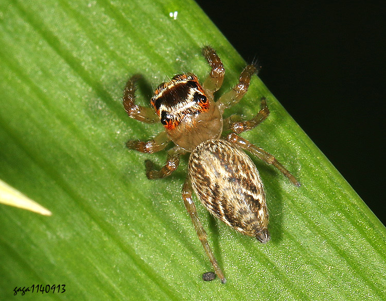 ↑垂雅蛛 (雌) / 1700公尺 (蠅虎科 / 雅蛛屬) 雌體長6-7mm、雄5-6mm,,頭胸部眼域內具黑色短毛,其餘黃褐色,各腳黃褐色,腹背褐色密布白色斑,中央有1條白色寬型縱帶,2/3段左右各有一枚白斑,側緣具白色分布。雄蛛頭胸部側緣框白邊,身體瘦小,體色較暗。 本屬2種,本種主要紀錄於中高海拔1000-1800公尺山區顏色較鮮艷,普遍。 其他:930509、