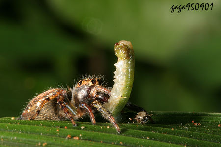 ↑垂雅蛛 ,雌,擅於捕食鱗翅目幼蟲 ,以螫肢麻痺小蟲後再分泌唾液溶解吸食。