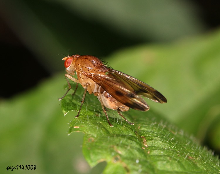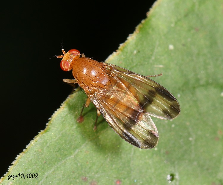 (縞蠅科 / 同脈縞蠅屬) 體長6.5mm,胸部寬廣,黃褐色,腹背具褐色環紋,翅膀不透明,近翅端有一枚黑褐色暈染的斑塊。