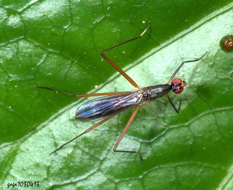 ↑蝶微腳蠅屬 Rainieria sp. (微腳蠅科)體長11.1mm,雌,頭部寬廣,橢圓形橫向,胸背板黑色,中胸背板略扁平,翅膀長,近翅端為藍灰色光澤,各腳腿節黃褐色,脛節黑色,中腳跗節白色。 本科4屬7種,本種紀錄於低海拔約600-800公尺山區,棲息陰暗潮濕的林道,停棲葉上,稀少。 本屬1種,為 白翅微腳蠅 Rainieria leucochira