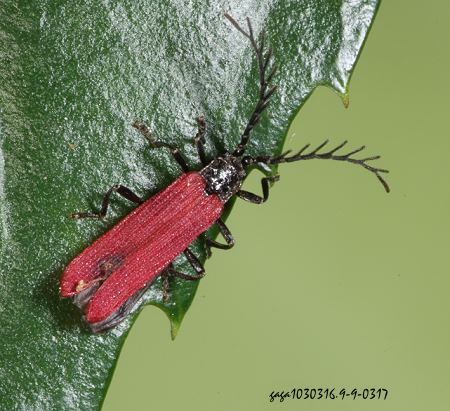 ↑卡氏窄胸紅螢 (雄) (紅螢科)體長7.3-9mm,體形狹長,頭背密生黃褐色短毛,觸角各鞭節除第一節和末節外端部側生分枝,前胸背板黑色略呈方形,上緣側角弧形,下緣側角尖,表面呈凹凸瘤狀,小盾板黑色,翅鞘紅色或橙紅色具不明顯的縱向條紋;與近似種相較,本種櫛翅較細,枝狀。 本種普遍分布於低中海拔山區,棲息低矮的樹林,數量很多。
