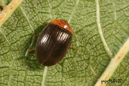 ↑扁泥蟲,卵型,前胸背板橙紅色,翅鞘黑褐色具不明顯的縱紋;外觀近似金花蟲科,但本種生活史與金花蟲不同,幼蟲水棲,成蟲常出現於上游的溪邊環境,四月拍攝,出現的季節很短。(體長3.1mm)