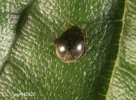 (圓花蚤科) 體長2.5mm,體型較圓,前窄後寬,近端部圓弧型,翅鞘黑褐色,密生均勻細緻的白毛。