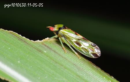 ↑肖片葉蟬屬 Parapetalocephala sp. (思源林道) (葉蟬科 / 耳葉蟬亞科) 體長5-6mm,小型,體形狹長,複眼紅色,前胸背板及翅膀綠色具白色的脈紋,翅脈白色發達,近翅縫黑褐色,各腳綠色,跗節黃褐色。 本種斑紋及顏色十分漂亮,紀錄於中海拔山區,已知於宜蘭、大雪山有紀錄,棲息低矮的草叢,為稀少的種類。