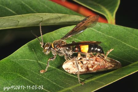 ↑黃腰虎頭蜂,分布於中海拔山區個體,獵捕葉蟬。