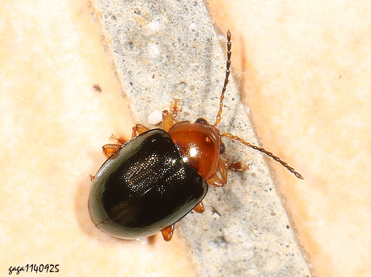 ↑銅翅卵葉蚤 (金花蟲科 / 葉蚤亞科 /卵葉蚤屬) 體長 3 mm,前胸背板紅褐色,近後緣中央有一枚黑色斑,觸角黃褐色,近端部顏色漸黑,翅鞘黑色具光澤。 本屬3種,本種紀錄於800-2000公尺山區,近後緣中央有一枚黑色斑,寄主菊科的台灣款冬,發現棲息懸鉤子類植物,稀少。 其他:1140926、