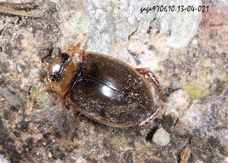 ↑姬麗龍蝨 (草嶺山) (龍蝨科 / 麗龍蝨屬) 體長7mm,體型橢圓形,末端較狹,頭部後緣兩眼間有一條黑色橫帶,前胸背板黃褐色,前後緣具黑色橫紋,翅鞘黑褐色,上面密生黑色不規則的刻點,翅膀前緣有淡黃色邊紋,腹面紅褐色,前中腳黃褐色,後腳褐色,扁平,腿節、脛節寬大,跗節發達,末端漸尖具毛列,適於水中划行與推進。 本屬6種,分布於中海拔山區,棲息水域環境,夜晚會趨光,有時可在路燈下發現牠們的蹤跡。